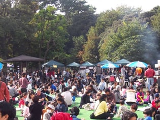大人は隣のテーブルでお酒を飲みながら笑顔で鑑賞。 夜は音楽楽しみながら芝生に座ってホットワイン