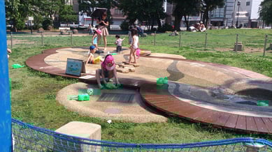真ん中の芝生広場は裸足で遊んでいただくスペース! 子供たちは大はしゃぎで走り回ります。